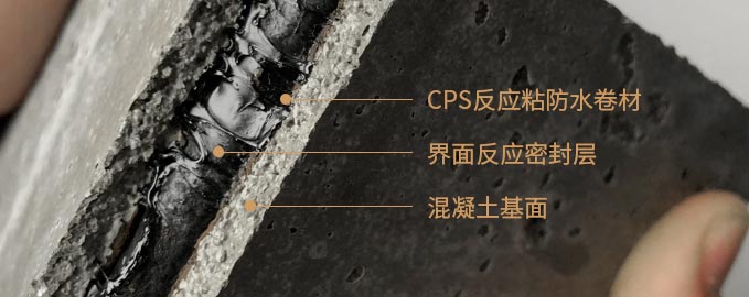 CPS反應(yīng)粘卷材通過(guò)CPS粘結(jié)效應(yīng)與混凝土基層牢固粘結(jié),形成界面反應(yīng)密封層,與混凝土基層融為一體。