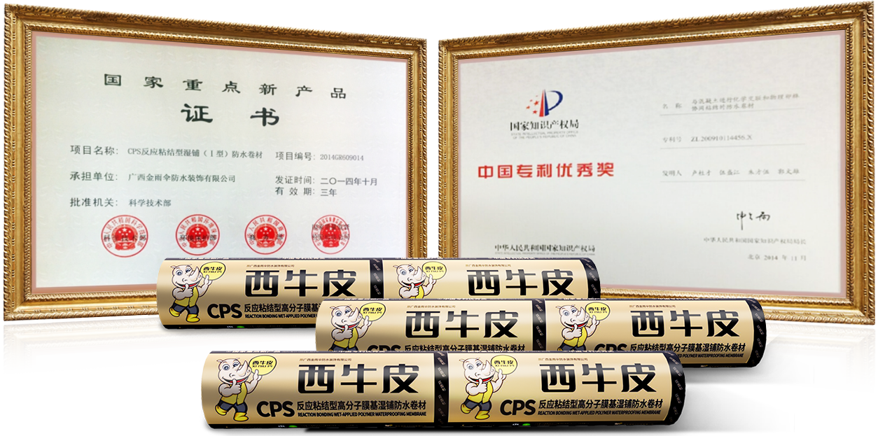- 國(guó)家重點(diǎn)新產(chǎn)品國(guó)內(nèi)濕鋪防水卷材首次獲得此證書(shū)的產(chǎn)品CPS反應(yīng)粘濕鋪防水卷材,2014年獲國(guó)家重點(diǎn)新產(chǎn)品計(jì)劃項(xiàng)目立項(xiàng)(國(guó)科發(fā)計(jì)(2014)303號(hào)),這是國(guó)家層面對(duì)西牛皮防水(原廣西金雨傘防水)突破混凝土建筑滲漏難題技術(shù)瓶頸的肯定,是目前國(guó)內(nèi)濕鋪防水卷材唯一.獲得此證書(shū)的產(chǎn)品。